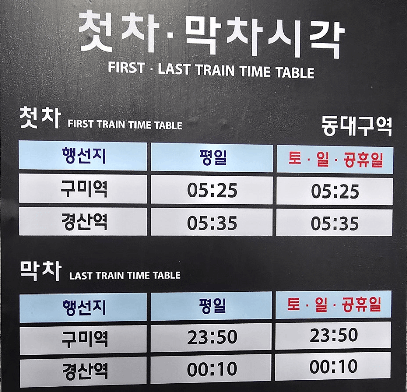 - 동대구역 → 구미역 방향 첫차: 오전 5시 25분